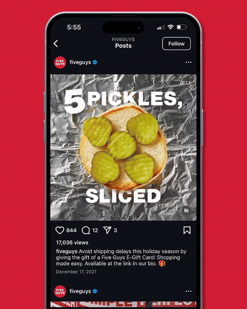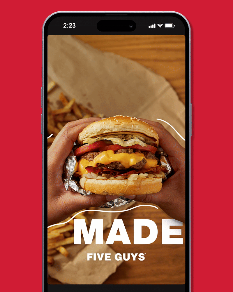 During my time at MRY in the early days of the pandemic, our team was tasked with refreshing the Five Guys social feed. With no ability to produce new photo shoots, we repurposed existing assets & gave them a fresh, updated look. We developed revamped social guidelines to be used across the brand’s feeds—an example slide is shown below. I created imagery for both in-feed posts & stories, with much of the work delivered as animated GIFs.